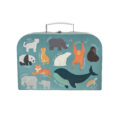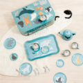 Ein komplettes Teesets aus Blech in einem hübschen Laminat-Karton-Koffer, um alles zusammen zu halten.